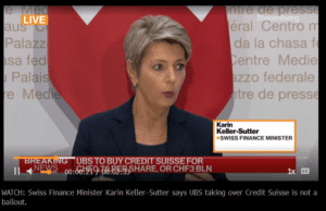 billions of francs in guarantees to UBS and the central bank was forced to provide extensive liquidity backstops to facilitate the rescue, putting taxpayers at risk 15 years after they bailed out UBS. Swiss Finance Minister Karin Keller-Sutter acknowledged it was the only way to stabilize international financial markets. Lots of Swiss money is being put up to help absorb any shocks from the deal, from a 9 billion franc guarantee on possible